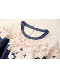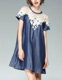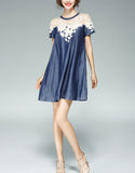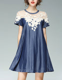 Short sleeve A-line denim dress with embroidery and beads