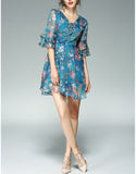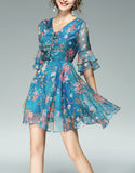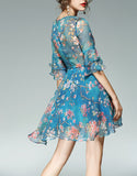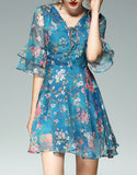 Mid-length flared sleeves short floral flared print dress